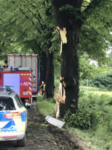 Bei einem schweren Verkehrsunfall auf der B432, zwischen Nahe und Kayhude, kam aus bislang ungeklärter Ursache ein PKW von der Fahrbahn nach links ab und stieß frontal gegen einen Baum. Vor Ort musste der Fahrer durch eine Sofortrettung aus dem zusammengedrückten PKW, mit Hilfe von schwerem technischen Rettungsgerät, befreit werden. Der Fahrer erlag leider noch an der Unfallstelle seinen schweren Verletzungen. Die B432 war während der Rettungsarbeiten voll gesperrt. Während der Aufräumarbeiten wurde der Verkehr einspurig an der Unfallstelle vorbeigeleitet.