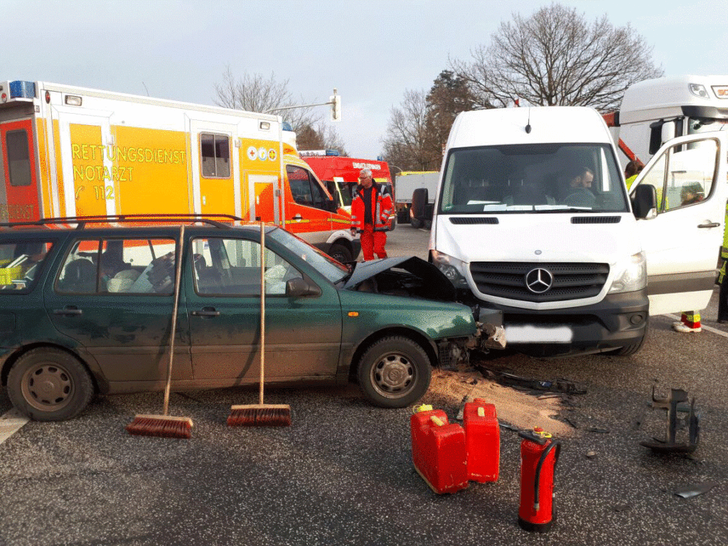 Aus bislang ungeklärter Ursache stießen ein Kleintransporter und ein PKW zusammen. Die beiden Fahrer wurden vom Rettungsdienst betreut. Auslaufende Betriebsmittel wurden gebunden und aufgenommen. Im Kreuzungsbereich kam es durch die Rettungs- und Aufräumarbeiten zu Behinderungen.